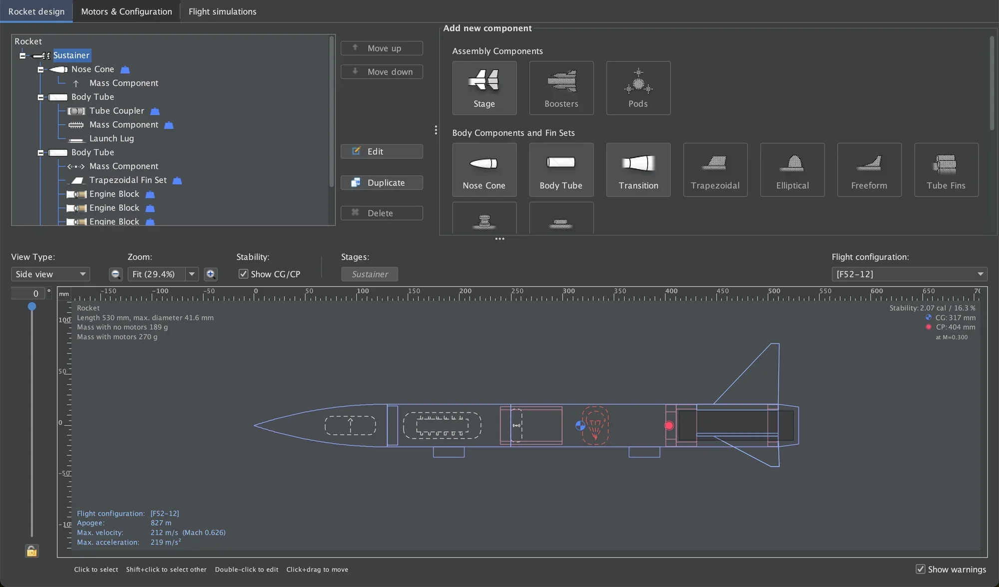 To design and simulate my rockets, I primerily use a tool called OpenRocket. Generally, I create an inital design based on my mental idea of what the rocket should look like, making up most of the dimensions as I go. Then, I adjust the length, weight distribution, and fin shape/size to get the stability to a good point. After this, I start to fine-tune the rocket, optimizing for apogee or something else, while keeping stability high and the ground hit velocity low, to ensure a smooth flight.